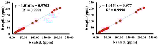 Regression analysis of the experimental (exptl.) versus calculated (calcd.) 13C NMR chemical shifts of 1 (left) and 2 (right).