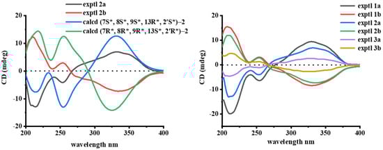 The application of single-crystal X-ray crystallography technique is an unambiguous method to determine the configuration of C-2’ in 2-methylbutanoyl fragment. Fortunately, a high-quality single crystal of 2b was successfully obtained in a mixed solvent (acetone–water, 9:1) for X-ray diffraction. The results afforded fatal evidence for the absolute configuration of 2b at C-2′, with a Flack parameter of 0.01(7) (CCDC 2080724) (Figure 4). Therefore, the absolute stereochemistry of 2b was explicitly assigned as 7R, 8R, 9R, 13S, 2′R. The absolute configuration of 2a could be accordingly assigned as 7S, 8S, 9S, 13R, 2′S, since 2a/2b were a pair of enantiomers. Moreover, the quantum chemical ECD calculation method was used to further confirm the absolute configuration of 2a and 2b. The theoretically calculated ECD data of (7S*, 8S*, 9S*, 13R*, 2′S*)-2 and (7R*, 8R*, 9R*, 13S*, 2′R*)-2 were in good agreement with the experimental ECD data of 2a and 2b, which supported the assignment of the absolute configurations of 2a and 2b as 7S, 8S, 9S, 13R, 2′S and 7R, 8R, 9R, 13S, 2′R, respectively (Figure 5). Accordingly, the absolute configurations of 1a/1b were respectively assigned as 7S, 8S, 9S, 13R, 2′R and 7R, 8R, 9R, 13S, 2′S by comparing their experimental ECD curves and NMR data with the C-2′ epimers 2a/2b (Figure 5).