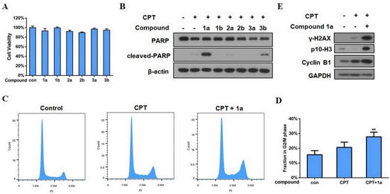 (A) MCF-7 cells were exposed to compounds (1a–3b) for 48 h. The cells viability was measured via MTT assay. The group for con means MCF-7 cells only treated with DMSO. (B) MCF-7 cells were incubated with 50 nM CPT, with or without 20 μM compounds, for 48 h, western blotting was used to analyze the level of cleaved-PARP and PARP. (C) After treatment with CPT plus 1a for 48 h, the cell cycle of MCF-7 cells was determined through flow cytometry. (D) The percentages of G2/M phase. The group for con means MCF-7 cells only exposed to DMSO. ** p < 0.01vs Con group. (E) MCF-7 cells were treated with CPT and 1a in combination for 48 h, the levels of relative protein (p10-H3, cyclin B1, γ-H2AX) were investigated by western blotting.