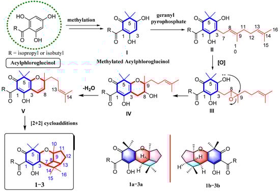 (±)-Hypersines A–C represent the first example of MTPAPs with a rare 6/6/5/4 ring system, which is quite different from the known MTPAPs. The plausible biosynthetic pathway for 1–3 was proposed (Scheme 1). Acylphloroglucinol was considered as the biogenetic precursor to PPAPs, which had undergone methylation reaction to obtain intermediate I with a filicinic acid core. Subsequently, intermediate II could be formed by the enzyme-catalyzed addition of geranyl pyrophosphate to the filicinic core. Then, epoxidation occurred at Δ [8] to generate an epoxypropane intermediate III. Next, the six-membered oxygen ring was formed and generated intermediate IV. After the dehydration of OH-8, the unsaturated pyranoid ring was generated. Finally, the 6/6/5/4 tetracyclic skeleton was connected by [2 + 2] cycloadditions [9,19].