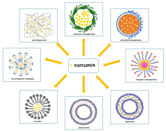 - Promoting its absorption by loading curcumin into particles carrier that contain substances able to increase epithelium cell membranes permeability or block efflux transporters [147]. Therefore, in order to ameliorate curcumin’s pharmacokinetic characteristics, various methodological approaches have been attempted, such as polymeric approaches, magnetic approaches, solid lipid nanoparticles, liposomes, phytosomes, micelles, β-cyclodextrins and solid dispersions [21,25,26,27,28,29,30,148,149,150] (Figure 3) [151,152,153,154]. In addition to these approaches, curcumin conjugation with substances, such as piperine, which is able to inhibit its metabolism [27,155], has emerged as a prominent solution to increase curcumin serum concentration.