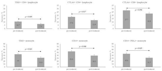 On the other hand, PD-1, CTLA-4, and TIM3 were all increased on CD4+, CD8+ lymphocytes and monocytes. Although they are only representatives of immune checkpoints, these increases might be caused to counteract the inflammatory response to the initial stage of Mtb infection [21]. Among the immune checkpoints, TIM3+CD4+, CTLA-4+CD4+, CTLA-4+CD8+, and TIM3+ monocytes were significantly lower with CD14+ monocytes after LTBI treatment, suggesting that some of them might be an evasion mechanism due to Mtb. Furthermore, the increases might also be an exhaustion mechanism for tolerance of chronic Mtb infection [10,27]. Notably, not only the lymphocytes surrounding the granulomas but also those in peripheral blood have over-expressed immune checkpoints, leading to a tolerance of LTBI status. The details of tolerance activation in peripheral blood still requires future investigation.