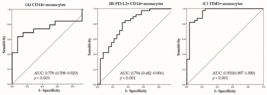 Multi-variable logistic regression analysis using a stepwise method by significant factors in univariate analysis showed that only the total CD14+ monocyte was a significant factor for LTBI-non-CKD in comparison with the HC group (OR: 1.046, 95% CI: 1.016–1.077, per 1% increment, p = 0.003). The area under the receiver operating characteristic curve (AUROC) was 0.759 (95% confidence interval (CI): 0.598–0.920, p = 0.003), as shown in Figure 3A. The cut-off point of total CD14+ monocytes was 51.85% with sensitivity of 0.632 and specificity of 0.929 by the Youden index. Comparing the LTBI-ESRD and HC groups, PD-L2+CD14+ monocytes (OR: 0.963, 95% CI: 0.928–0.999, per 1% increment, p = 0.045) and TIM3+ monocytes (OR: 1.123, 95% CI: 1.063–1.186, per 1% increment, p < 0.001) were independent factors in multivariable logistic regression. The AUROCs of PD-L2+CD14+ monocytes (Figure 3B) and TIM3+ monocytes (Figure 3C) were 0.794 (95% CI: 0.682–0.906, p < 0.001) and 0.950 (95% CI: 0.897–1.0, p < 0.001). The cut-off value for TIM3+ monocytes was 13.66% with sensitivity of 1.0 and specificity of 0.786, and the cut-off value of PD-L2+CD14+ monocytes was 40.58% with sensitivity of 0.605 and specificity of 0.782.