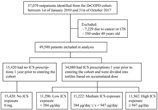 Flow diagram for the study population. Patients with at least 1 outpatient clinical visit between 1st of January 2010 and 31st of October 2017 were included from the Danish register for COPD (DrCOPD). Patients younger than 40 years old or with cancer other than basal cell carcinoma of the skin were excluded. Patients were divided into four groups on the basis of the accumulated ICS dose one year prior to entering the cohort. Abbreviations: CIS: carcinoma in situ. ICS: Inhaled corticosteroid.