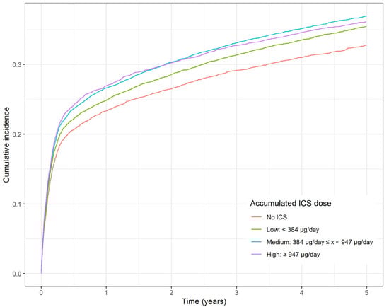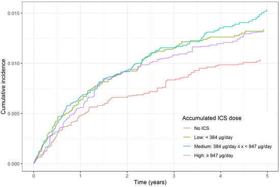 The accumulated ICS exposure for one year prior to cohort entry was calculated in budesonide equivalents, and the patients were grouped into four groups based on the exposure (Table A1); no ICS use, low ICS exposure, moderate ICS exposure and high ICS exposure based on the tertiles for the accumulated ICS dose. The group with no ICS exposure served as reference for the other.