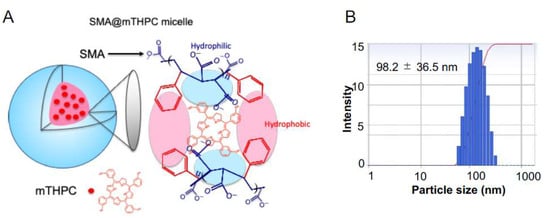 (A) Diagrammatic illustration of the micelle structure of SMA@mTHPC and (B) the hydrodynamic size of SMA@mTHPC in aqueous solution determined by dynamic light scatter (DLS).