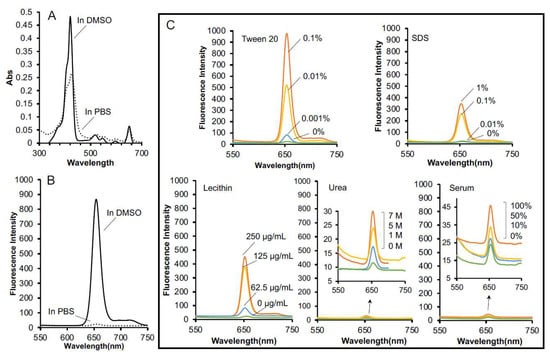Characterization of the micelle formation of SMA@mTHPC. The UV–VIS spectra (A) and fluorescence spectra (B) of SMA@mTHPC in PBS as well as in DMSO were measured. The fluorescence spectra of SMA@mTHPC in the presence of detergent (Tween 20, SDS), the cell membrane component (lecithin), urea, and serum are shown in (C). See text for details.