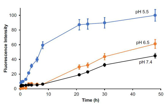 The release of mTHPC was largely increased at acidic pH; the release rate reached 50% after 48 h incubation at pH 6.5, and it further reached 90–100% at pH 5.5 (Figure 3). Given that tumors always show slight acidic pH (6.0–7.0) [30], tumor-specific release of free mTHPC could be anticipated for SMA@mTHPC.