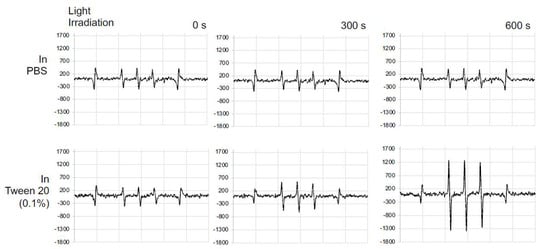 SMA@mTHPC was dissolved in PBS at 400 μg/mL (40 μg/mL mTHPC equivalent) with/without 0.1% Tween 20, to which 20 mM 4-oxo-TEMP (spin trapping agent) was added. Samples in a flat quartz cell (Labotec, Tokyo, Japan) were irradiated (25 mW/cm2) for the indicated times, by using xenon light source (MAX-303; Asahi Spectra Co. Ltd., Tokyo, Japan) at 400–700 nm. The ESR spectrometer was usually set at a microwave power of 1.0 mW, amplitude of 100 kHz, and field modulation width of 0.1 mT.