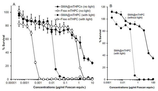 In vitro dark cytotoxicity and photocytotoxicity (PDT) of SMA@mTHPC in mouse colon cancer C26 cells (A) and African green monkey kidney cells (CCL-81) (B). Cells (5000/well) were seeded in a 96-well plate; after 24 h pre-incubation, different concentrations of SMA@mTHPC were added, and after further 24 h incubation, the viability of cells was measured by MTT assay. Photocytotoxicity was examined by irradiating the cells with light (blue light of 420 nm, 1 J/cm2) at 24 h after addition of SMA@mTHPC. Data are mean ± SD, n = 6–8. See text for details.