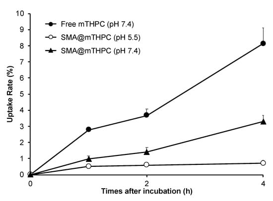 As shown in Figure 6, free mTHPC was rapidly taken up by cancer cells, and almost 10% of the applied drugs were internalized within 4 h. In contrast, SMA@mTHPC showed a 10-time lower intracellular uptake than free mTHPC; however, at pH 5.5, the internalization of SMA@mTHPC was significantly increased (Figure 6). These findings are parallel with the results of release profiles (Figure 3), again suggesting the release of free mTHPC is a key factor for the therapeutic effect of SMA@mTHPC.