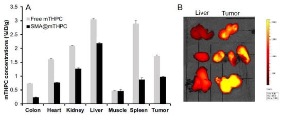 For investigating the body distribution of SMA@mTHPC, we first carried out in vivo imaging in a S180 transplanted tumor model by taking advantage of the fluorescence property of mTHPC. As shown in Figure 7A, we found a relatively high accumulation of SMA@mTHPC in tumor at 24 h after i.v. injection, which was higher than those in most normal tissues including the muscle, colon, and heart. Compared to the tumor, higher accumulation in the liver, which is rich in the reticuloendothelial system that captures macromolecules, was observed (Figure 7A); however, in vivo imaging showed a much lower fluorescence in the liver than that in the tumor (Figure 7B). Moreover, relatively high accumulation was also observed in the kidney, which indicates the gradual release of free mTHPC in circulation. Similar distribution was also found for free mTHPC after i.v. injection, although it had to be dissolved in organic solvent (i.e., DMSO), which suggests that mTHPC may bind to serum proteins, thus behaving as large molecules similar to Evans blue, as described in many previous studies in the literature [6,31].