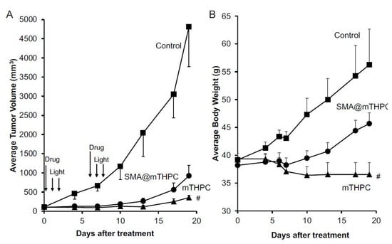 In vivo PDT effect of SMA@mTHPC in S180 solid tumor. A xenon light source was used (MAX-303; Asahi Spectra). Indicated concentrations of SMA@mTHPC were injected i.v. when tumor diameters reached 8–10 mm. After 24 and 48 h, light irradiation (90 mW/cm2, 5 min, 27 J/cm2) was carried out. Tumor volume (A) and body weight (B) were measured every 2 or 3 days. Arrows indicate the application of SMA@mTHPC or mTHPC, and light irradiation. Data are means ± SD; n = 4–8. # one mouse died during the treatment using mTHPC. See text for details.