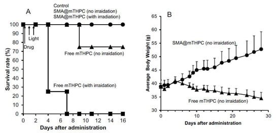 The mouse S180 tumor model described above was used in this study. At 7–10 days after tumor inoculation when the diameters of tumors reached approximately 8–10 mm, SMA@mTHPC dissolved in physiological saline was injected intraperitoneally (i.p.) at a concentration of 10 mg/kg (mTHPC equivalent). Native mTHPC that was dissolved in DMSO was administered i.p. at the same concentration (10 mg/kg). To some of the mice receiving SMA@mTHPC or mTHPC, irradiation to the tumor area was carried out by xenon light (MAX-303; Asahi Spectra) at 400–700 nm for 5 min (27 J/cm2) at 24 h after injection of SMA@mTHPC or mTHPC. The conditions and survival of the mice were monitored regularly.