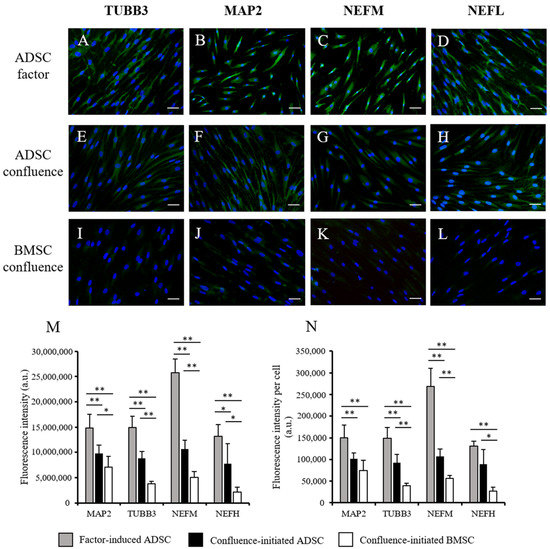 Comparison of neuron-related protein expressions of the ADSCs and BMSCs during confluence-initiated neurogenic differentiation. (A,E,I) Class III β-tubulin (TUBB3), (B,F,J) microtubule-associated protein 2 (MAP2), (C,G,K) neurofilament medium polypeptide (NEFM), and (D,H,L) neurofilament light polypeptide (NEFL) of the factor-induced ADSCs, confluence-initiated ADSCs, and confluence-initiated BMSC differentiated neuron-like cells on day 7 detected by immunofluorescence staining are shown in green fluorescence. DNA stained by DAPI is shown in blue fluorescence (magnification × 100; the scale bar = 100 µm). (M) The mean of the total immunofluorescence intensity from a fixed number of cells in six fields of one slide was quantified by the Image-Pro Plus v4.5.0.29. (N) The mean of the value that was normalized to the cell numbers in the field was calculated. All the values are expressed as mean ± S.D. with three experimental replicates. Statistical significance to compare the multiple groups was determined using one-way ANOVA analysis. “*” represents p < 0.05. “**” represents p < 0.01.