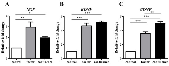 Neurotrophic gene expressions of the ADSCs during factor-induced and confluence-initiated neurogenic differentiation. Neurotrophic gene expressions, including the nerve growth factor (NGF) (A), brain-derived neurotrophic factor (BDNF) (B), and cell-derived neurotrophic factor (GDNF) (C) in the factor-induced (factor) and confluence-initiated (confluence) differentiated ADSCs on day 7 were detected by RT-qPCR. The value of each gene expression was normalized to the expression of glyceraldehyde-3-phosphate dehydrogenase (GAPDH). Relative fold changes of the values of the factor-induced and confluence-initiated differentiated ADSCs were compared with the value of the control (without induction) as one. The values are expressed as mean ± SEM with three experimental replicates. Statistical significance was determined using the one-way ANOVA test. “*” represents p < 0.05. “**” represents p < 0.01. “***” represents p < 0.001.