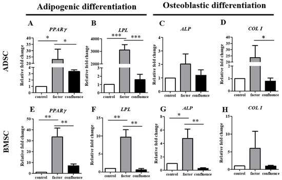 The adipogenic and osteogenic differentiation in the ADSCs and BMSCs was also determined by RT-qPCR. Peroxisome proliferator-activated receptor γ (PPARγ) and lipoprotein lipase (LPL) genes were detected to verify the adipogenic differentiation in the ADSCs (Figure 5A,B) and BMSCs (Figure 5E,F). Alkaline phosphatase (ALP) and collagen type I (COL I) genes were used to determine the osteogenic differentiation of the ADSCs (Figure 5C,D) and BMSCs (Figure 5G,H). Adipogenic and osteogenic genes were highly expressed in the factor-induced differentiation of the ADSCs and BMSCs, which explained that fact that differentiation could be induced by a factor-inducing medium. However, there were significantly fewer adipogenic genes in the differentiated ADSCs and BMSCs in the confluent situation. In the confluence-initiated osteogenic differentiation, neither ALP nor COL I was high in the differentiated ADSCs and BMSCs.