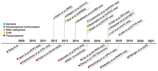 Timeline of technical progress of single-cell analysis. Each method was divided into five categories (genome, chromosomal conformation, DNA methylome, ChIP, and transcriptome) and identified by different colors.