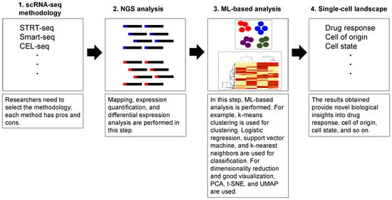 In this section, we discuss the technical aspects of scRNA-seq with ML. scRNA data can be obtained from whole cells or fractionated samples. Similar to the usual RNA-seq methods, we can analyze scRNA-seq data from whole cell samples either to classify cells of origin or cell types []. For fractionated samples in particular, nuclear fractionation, known as single-nucleus RNA-seq (snRNA-seq), has been reported [,]; moreover, snRNA-seq is applicable even in frozen human tumor tissue samples []. Although we do not discuss the details here, single-cell technology utilizes other omics data such as single-cell DNA sequencing (scDNA-seq), which can detect copy number variations (CNVs) as well as clonal populations []; additionally, it can be used for single-cell whole genome analysis [], DNA methylation [], or in situ sequencing known as FISSEQ [], MERFISH [], and seqFISH []. Moreover, scRNA-seq driven classification in metastatic lung adenocarcinoma shows the feasibility of revealing cellular dynamics, tumor intrinsic factors, and novel signatures that are associated with patient outcome [].