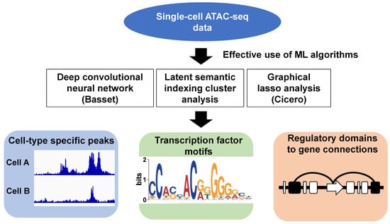 Next, we will describe some research examples of single-cell ATAC-seq using an unsupervised ML algorithm. Cusanovich et al. constructed a single-cell atlas of adult mouse tissues and characterized 85 distinct chromatin patterns across 13 different tissues []. After combining various ML algorithms (e.g., LSA, Cicero, and Basset) [], they annotated key regulatory sequences and TFs in diverse mammalian cell types. Moreover, it is anticipated that this dataset can be utilized to investigate common human traits and diseases through comparing human genome with mouse genome (Figure 3).