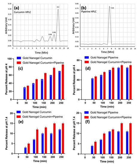 Determination of drug release kinetics; (a) curcumin HPLC; (b) piperine HPLC; (c) kinetic release of curcumin from nanogels at pH 4; (d) kinetic release of piperine from nanogels at pH 4; (e) kinetic release of curcumin from nanogels at pH 7.4; (f) kinetic release of piperine from nanogels at pH 7.4.