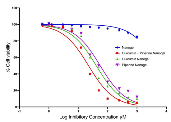The PDMAEMA chains in the lignin-based nanogels collapsed to smaller dimensions at a lower pH [33]. The release of the curcumin–piperine from the gold nanogel was higher at different time intervals and pH, compared with the curcumin-loaded gold nanogel and piperine-loaded nanogel separately. The kinetic release of drugs at the acidic pH plays a significant role in cancer medicines due to the acidic nature of the cancer cells [2,3]. The high kinetic release of the drugs from the drug-loaded nanogel at a low pH may help to control the release of the drug in cancer cells following endocytosis and trafficking to the lysosomal compartment.