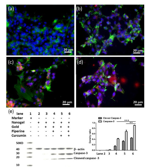 Immunoblotting of U-251 MG cells was performed after the treatment with drug-loaded gold nanogel. The laser scanning microscopic image analysis of U-251 MG cells was performed after 72 h of incubation of glioma cells at 21 µM of curcumin and piperine gold nanogels. It was observed that the treatment of U-251 MG cells with the nanogels resulted in the alteration of cellular cytoskeletal protein F-actin which induced the caspase-3 induction of apoptotic pathways (Figure 5a–d). The Western blot analysis results revealed the active protein expression of caspase-3, cleaved caspase-3 and β-actin. The nanogel was used as a negative control. The use of a nanogel alone or gold nanogel as an anticancer drug against the GBM cells did not show the activity of caspase-3. However, the piperine-loaded gold nanogel showed the expression of caspase-3 protein with a very thin band while a dense band was observed when curcumin-loaded nanogel was used as an anticancer drug against GBM cells. The higher expression of caspase-3 was observed when the hybrid curcumin–piperine-loaded nanogel was used (Figure 5e). There are statistical differences between hybrid curcumin–piperine-loaded gold nanogel with curcumin or piperine-loaded gold nanogel (** p < 0.01, *** p < 0.001).