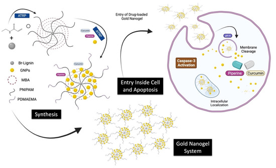 The gold nanoparticles were synthesized by using the chemical reduction of the chloroauric acid into gold nanoparticles. The association of the GNPs with the lignin polymers resulted in the crosslinking to form the self-assembled gold nanogels. The two-step atom transfer radical polymerization resulted in the synthesis of Lignin-g-PNIPAM and GNPs-b-PDMAEMA, while the N-N’ methylene bisacrylamide (MBA) was used as a crosslinker chain. The detailed layout of the synthesis of the gold nanogel therapeutic system is explained in Figure 1.