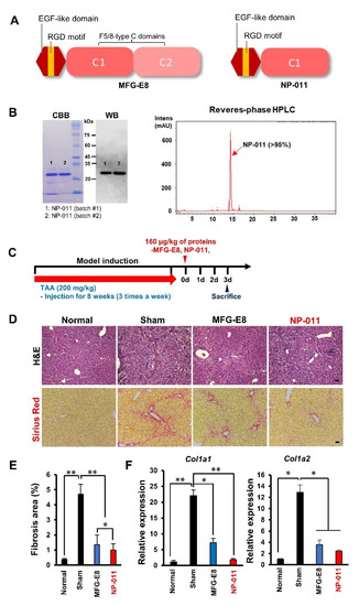 Production of truncated MFG-E8 and the advantages of NP-011 for treating liver disease. (A) Structural comparison of MFG-E8 and NP-011. (B) Confirmation of synthesized NP-011. Coomassie brilliant blue (CBB) staining and Western blot analysis showed ~25 kDa sized truncated forms of MFG-E8 (NP-011). The purity of the produced NP-011 protein (Batch #2) was analyzed by reverse-phase HPLC analysis. (C) Overall schematic schedule for testing the efficacy of the human recombinant proteins in a liver fibrosis model. The red arrow indicates the period for TAA administrations for inducing liver fibrosis. (D) Representative images of histological analysis (H&E and Sirius red staining) for the liver of normal mice, a TAA-induced liver fibrosis model (Sham), and a protein (MFG-E8, NP-011) administered liver fibrosis model. Scale bar, 200 μm. (E) Comparison of the quantitative fibrotic area in the livers of the mice. (F) Comparison of mRNA expression for fibrotic markers (Col1a1, Col1a2) in the liver of normal mice, a TAA-induced liver fibrosis model (Sham), and a protein (MFG-E8, NP-011) administered liver fibrosis model. Bars represent the means ± SD from three replicates in each group. * p < 0.05, ** p < 0.01, ANOVA followed by Tukey’s multiple comparison test.