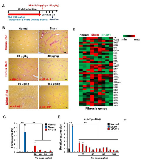 Resolution of fibrosis by administration of various doses of NP-011. (A) Overall schematic schedule for testing the efficacy of the NP-011 in a liver fibrosis model. The red arrow indicates the period for TAA administrations for inducing liver fibrosis. (B) Representative images for comparing the fibrotic areas (Sirius red stained areas) in the liver of normal mice, a TAA-induced liver fibrosis model, and an NP-011-administered liver fibrosis model at various doses (20–160 μg/kg). Scale bar, 200 μm. (C) Quantitative analysis of the fibrotic areas in the livers of tested mice in B. Tx. indicates treatment. Bars represent the means ± SD from four mice in each group. ** p < 0.01, Student’s t-test. (D) Heatmap data show fibrosis-relevant genes observed in livers from normal mice, TAA-induced mice, and NP-011-administered liver fibrosis mice. (E) Comparison of α-SMA (Acta2) expression in the liver of normal mice, a TAA-induced liver fibrosis model, and an NP-011-administered liver fibrosis model by quantitative PCR. Tx. indicates treatment. ** p < 0.01, Student’s t-test.