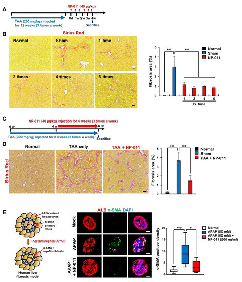 Therapeutic efficacy of a minimal effective dosage of NP-011 in various model inductions. (A) Overall schematic schedule for testing the efficacy of NP-011 in an advanced liver fibrosis model. The blue arrow indicates the period for TAA administrations for inducing liver fibrosis. (B) Representative images for analyzing fibrotic areas in livers of normal mice, a TAA-induced liver fibrosis model, and a 40 μg/kg NP-011-administered liver fibrosis model with different numbers of administrations (1, 2, 4, and 6 times). Scale bar, 50 μm. Quantitative analysis of fibrotic areas in the livers of normal mice, a TAA-induced liver fibrosis model, and a 40 μg/kg NP-011-administered liver fibrosis model presented in the left panel. Bars represent the means ± SD from four mice in each group. ** p < 0.01, Student’s t-test. (C) Overall schematic schedule for testing the efficacy of NP-011 in a progressing liver fibrosis model. The blue arrow indicates the period for TAA administrations for inducing liver fibrosis. The red arrow indicates the period for NP-011 administrations. (D) Representative images for analyzing fibrotic areas in livers of normal mice, a TAA-induced liver fibrosis model, and a TAA-injected liver fibrosis model with co-administration of NP-011. Scale bar, 100 μm. Quantitative analysis of fibrotic areas of livers in normal mice, a TAA-induced liver fibrosis model, and a TAA-injected liver fibrosis model with co-administration of NP-011 presented in (D). Bars represent the means ± SD from five mice in each group. ** p < 0.01, Student’s t-test. (E) Left panel: Graphical description representing a human liver fibrosis model using human embryonic stem cell (hESC)-derived hepatocytes and human primary HSCs treated with APAP. Middle panel: Representative images for analyzing hepatocytes and activated myofibroblasts with ALB (red) and α-SMA (a biomarker for fibrosis, green). Scale bar, 50 μm. Right panel: Quantitative analysis of the percentage of α-SMA positive cells in the human liver fibrosis model. Bars represent the means ± SD from five replicates in each group. ** p < 0.01, * p < 0.05 Student’s t-test.
