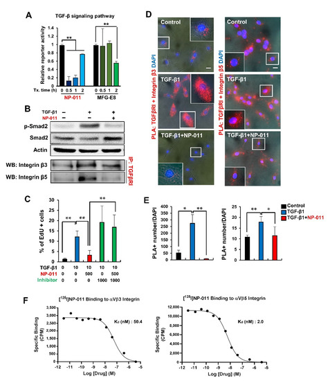 Proximity ligation assay (PLA) revealed the direct physical associations between TGF-βRI and integrin β3 and β5, and the interactions became stronger upon TGF-β1 treatment in HSCs (Figure 4D,E). However, NP-011 treatment in TGF-β1-treated HSCs significantly loosened the associations between TGF- βRI and integrin β3 and β5 (Figure 4D,E). These physical associations were further confirmed by immunoprecipitation assay, and these patterns were identical to the Smad2 phosphorylation pattern by TGF and/or NP-011 treatment (Figure 4B). Finally, we determined the direct binding of NP-011 to integrin αvβ3 and αvβ5 by radioligand binding assays and confirmed the NP-011 binding to integrin β3 and β5 with calculated Kd values of 50.4 nM and 2.0 nM, respectively. Notably, NP-011 showed about 12-fold stronger binding to integrin β5 than did MFG-E8 (Kd of 25.4 nM, Supplementary Figure S2). NP-011 did not show binding affinity to other fibrosis-related integrin families such as integrin β1 and β6 (data not shown). These results suggest that NP-011 specifically binds to integrin β3 and β5 and interferes in the interaction between integrins and TGF-βRI, resulting in suppression of the TGF-β cascade and a decrease in HSC proliferation.