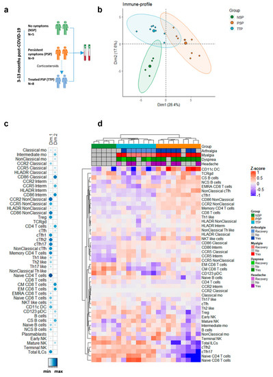 Deep immune profiling detected alterations in post-COVID-19 patients with persistent symptoms, which were corrected with a short course of corticosteroids. (a) Study design included three groups of post-COVID-19 patients: five subjects who recovered completely (green, NSP) and nine subjects with persistent symptoms (orange, PSP), eight of whom were sampled again after 4 days of prednisone treatment (blue, TTP). (b) Principal component analysis (PCA) based on all flow cytometry data. (c) Contribution of each variable to Dimensions 1 and 2 of PCA. (d) Unsupervised hierarchical clustering analysis and heatmap of log10-transformed and center-scaled variables.