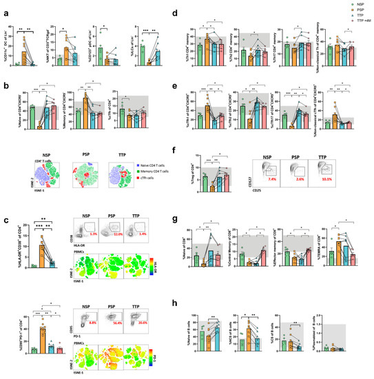 Immunological alterations in PSP include dysregulated innate and adaptive populations together with higher expression of activation factors. Comparison between NSP, PSP, TTP, and TTP+4M of (a) conventional dendritic cells (CD11b+ DC), natural killer T lymphocytes (NKT), plasmacytoid DC (CD123+ pDC), and innate lymphoid cells (ILC); (b) naïve, memory, and follicular helper T CD4+ lymphocytes; (c) expression of HLA-DR and CD38 and expression of CD95 and PD-1 on CD4+ T lymphocytes; (d) subsets of memory CD4+ T cells based on CXCR3 and CCR6 expression; (e) subsets of follicular helper T CD4+ lymphocytes; (f) regulatory T cells (Treg); (g) naïve, central memory (TCM), effector memory (TEM), and effector memory re-expressing CD45RA (TEMRA) CD8+ T cells; and (h) naïve, non-class-switched memory (NCS), class-switched memory (CS), and plasmablast B cells. Grey regions depict percent populations ranges, if available, obtained from groups of representative healthy donors in our clinical immunology laboratory. In (b), tSNEs were performed by using all 37 fluorochromes (see Methods); and in (c), tSNEs were performed in total CD4+ cells and using CXCR5, CD27, CCR7, CD45RA, CCR6, and CXCR3. *, p < 0.05; **, p < 0.01; ***, p < 0.001.