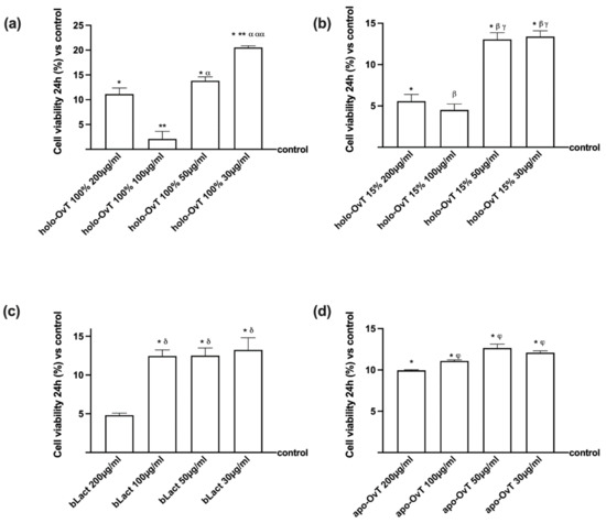 Dose-response study of cell viability on Caco-2 cell treated with different concentrations and different iron saturation types of OvT and bLact. Data are expressed as means ± SD compared to control (0% line) of four independent experiments produced in triplicate. (a) holo-OvT 100% saturated iron. * p < 0.05 vs. control; ** p < 0.05 vs. holo-Ovt 100% 200 μg/mL; α p < 0.05 vs. holo-Ovt 100% 100 μg/mL. (b) holo-OvT 15% saturated iron * p < 0.05 vs. control; β p < 0.05 vs. holo-Ovt 15% 200 μg/mL; γ p < 0.05 vs. holo-Ovt 15% 100 μg/mL; γγ p < 0.05 vs. holo-Ovt 15% 50 μg/mL. (c) bLact = bovine lactoferrin * p < 0.05 vs. control; δ p < 0.05 vs. bLact 200 μg/mL; ε p < 0.05 vs. bLact 100 μg/mL; εε p < 0.05 vs. bLact 50 μg/mL. (d) apo-Ovt * p < 0.05 vs. control; φ p < 0.05 vs. apo-Ovt 200 μg/mL; κ p < 0.05 vs. apo-Ovt 100 μg/mL.