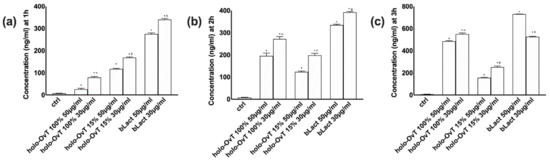 Regarding the CaCo-2 cells, a time-dependent effect (Figure 4) was also observed for all OvT forms and bLact at both 30 and 50 μg/mL; in particular, 30 μg/mL holo-OvT 15% was able to induce a greater effects compared to the control (p < 0.05) and compared to the same OvT form at 50 μg/mL (p < 0.05) and to the other molecules (p < 0.05) during all period analysed. The main result was observed at 3 h (Figure 4b) of stimulation (about 39%) and then decreased slowly until 24 h (about 16%, as illustrated in Figure 2). These results obtained in both cell types confirmed that OvT has a time-dependent effect and suggest that 30 μg/mL holo-OvT 15% may be the best option compared to the control (p < 0.05) and also compared to the bLact tested (p < 0.05), which is more evident at 3 h (about 52% compared to 30 μg/mL bLact and about 44% compared to 50 μg/mL bLact). Furthermore, based on the results, one dosage in 24 h in humans can be assumed. In addition, because the apo-OvT induced weaker results compared to holo-OvT forms, probably due to the lack of iron binding, this product was not used in the absence of iron-pre-treatment experiments.