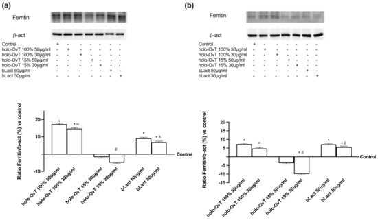 Western blot and densitometric analysis of Ferritin on total lysates of GTL-16 (a) and Caco-2 cells (b) of the VITVO® system. The cells were treated with 50 and 30 μg/mL of different OvT and bLact. The images shown are an example of each protein of four independent experiments reproduced in triplicates. The abbreviations are the same as reported in Figure 1. Data are expressed as means ± SD (%) of four independent experiments normalised and verified on β-actin detection. In (a) * p < 0.05 vs. control; α p < 0.05 vs. holo-Ovt 100% 50 μg/mL; β p < 0.05 vs. holo-Ovt 15% 50 μg/mL; δ p < 0.05 vs. bLact 50 μg/mL. In (b) * p < 0.05 vs. control; α p < 0.05 vs. holo-Ovt 100% 50 μg/mL; β p < 0.05 vs. holo-Ovt 15% 50 μg/mL; δ p < 0.05 vs. bLact 50 μg/mL.