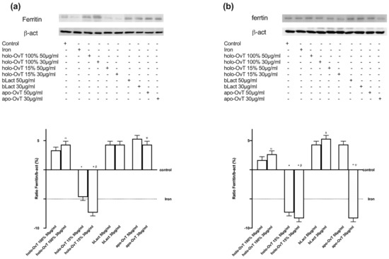 Western blot and densitometric analysis of ferritin on total lysates of GTL-16 (a) and Caco-2 cells (b) of the VITVO® system. The cells were treated with 50 and 30 μg/mL of different OvT and bLact. The images shown are an example of each protein of four independent experiments reproduced in triplicate. Iron= 50 μM Fe3+ and the abbreviations are the same as reported in Figure 1. Data are expressed as means ± SD (%) of four independent experiments normalised and verified on β-actin detection. In (a) * p < 0.05 vs. control; α p < 0.05 vs. holo-Ovt 100% 50 μg/mL; β p < 0.05 vs. holo-Ovt 15% 50 μg/mL; φ p < 0.05 vs. apo-Ovt 50 μg/mL. In (b) * p < 0.05 vs. control; α p < 0.05 vs. holo-Ovt 100% 50 μg/mL; β p < 0.05 vs. holo-Ovt 15% 50 μg/mL; δ p < 0.05 vs. bLact 50 μg/mL; φ p < 0.05 vs. apo-Ovt 50 μg/mL.