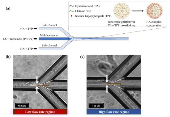 (a) Schematic representation of the hydrodynamic flow focusing within microfluidic chip. Middle and side streams lead to NPs formation through ionotropic gelation via CS-TPP crosslinking followed by HA–CS complex coacervation; (b,c) Optical image of the microfluidic device showing the hydrodynamic flow focusing at (b), low flow rate regime (middle channel flow rate < 1 μL/min) and (c) high flow rate regime (middle channel flow rate ≥ 1 μL/min). White arrows in both images indicate the width of the focusing stream, while the black line along the middle channel represents its elongation at the chip junction.