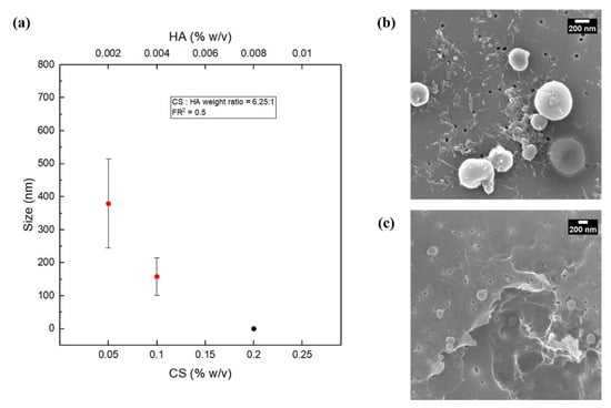 NPs’ size and morphology at constant polymer ratio reproducing batch conditions: (a) Plot showing size vs. CS and HA concentrations at CS: HA weight ratio equal to 6.25 at low flow rate regime (MFR = 0.3 μL/min and SFR = 0.6 μL/min). The black point indicates that only macroaggregates and unreacted materials are obtained, therefore the size was not measurable (see Figure S3 of the Supplementary Materials); (b) CS = 0.05% w/v; (c) CS = 0.1% w/v.