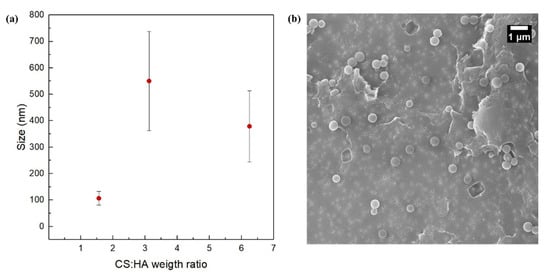 NPs’ size and morphology at different polymer ratios at low flow rate regime and FR2 = 0.5: (a) Plot of NP size vs. CS:HA weight ratio; (b) representative SEM image at CS: HA weight ratio equal to 3.12.