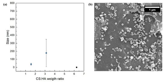 NPs’ size and morphology at different polymer ratios at high flow rate regime and FR2 = 0.5: (a) Plot of NP size vs. CS:HA weight ratio; (b) representative SEM image at CS: HA weight ratio equal to 1.56. The black point indicates that, at high flow rate regime and CS:HA = 6.25, macroaggregates and unreacted materials are obtained; therefore, the size was not measurable (see Figure S4 of the Supplementary Materials).
