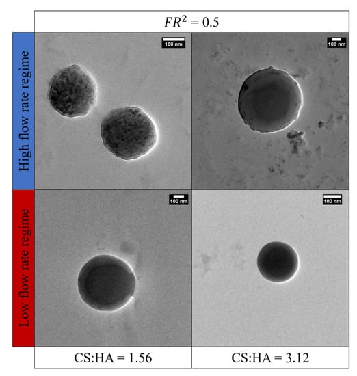 Among the tested conditions and parameters (listed in Table S1 of the Supplementary Materials), we focused our work on those that experimentally allowed reproducibility of the results, stability of the hydrodynamic flow focusing and high throughput. In particular, an FR2 of 0.5 has been chosen as the most reliable value to carry out the process. In detail, by keeping the FR2 constant, the experiments in the low flow rate regime have been conducted at the middle channel flow rate of 0.3 μL/min and side channels of 0.6 μL/min. On the other hand, experiments in the high flow rate regime have been performed in the middle channels at a flow rate of 3 μL/min and the side channels at 6 μL/min. The effect of polymer concentrations (ranging from 0.05 to 0.2% w/v for CS and from 0.002 to 0.008% w/v for HA) and polymer ratios (CS:HA ranging from1.56 to 6.25) at set FR2 conditions have been investigated as are discussed in the following at high and low flow rate regimes. Representative results obtained using other FR2 conditions are displayed in Figure S2 of the Supplementary Materials.