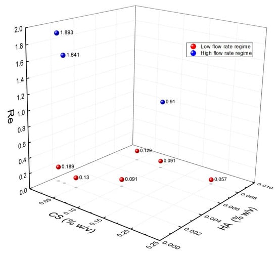 The effect of the flow rate regimes has been interpreted by analyzing the Reynolds number (Re) [82]. Taking into account the defined 1 μL/min threshold, Re values at FR2 = 0.5 have been calculated approximately considering two reproducible conditions: 0.6–0.3–0.6 μL/min and 6–3–6 μL/min (side channel–middle channel–side channel). Figure 6 shows the Reynold numbers at different CS and HA concentrations and distinguishing between high and low flow rate regimes (additional graphs on the relationships between the Reynold number and the CS concentration are reported in Figures S9 and S10 of the Supplementary Materials).