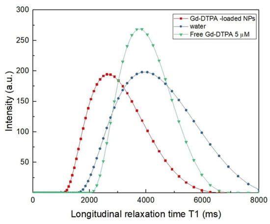 Additionally, the longitudinal relaxation time, , of the Gd-DTPA loaded NPs was measured using a benchtop relaxometer and compared with the of both water and free Gd-DTPA in water (Figure 7).