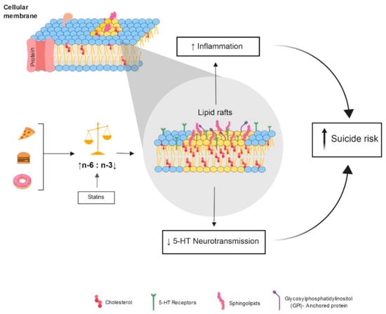 The second theory is in relation to the serotoninergic system. A decrease of cholesterol in the lipid rafts produces a decrease in the viscosity of the neuronal membranes. Low viscosity leads to a failure in the synaptic transmission, causing a decrease of serotonin intake via serotonin receptors (5-HT1A) []. It is known that among the serotonin functions are mood regulation. Furthermore, low levels of serotonin in the spinal fluid brain (CSF) have been observed in the postmortem of individuals who died by suicide []. Therefore, it might be that serum cholesterol levels reflect the serotoninergic activity []. Furthermore, fatty acid deficiency promotes an impaired serotonin and dopamine neurotransmission in the frontal cortex [].