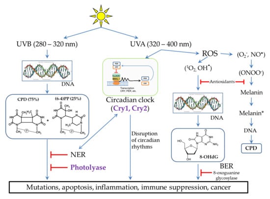 - Cadet, J.; Douki, T. Formation of UV-induced DNA damage contributing to skin cancer development. Photochem. Photobiol. Sci. 2018, 17, 1816–1841. [Google Scholar] [CrossRef]