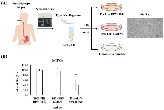 Isolation and characterization of hGFCs. (A) Schematic of the isolation protocol used. The stomach tissue was digested with collagenase IV for 1 h. The cells were cultured with 10% FBS RPMI1640, 10% FBS DMEM, or FibroLife serum-free medium, and images of cell morphology were obtained by a digital microscope. Scale bar 100 μm (100× magnification). (B) hGFCs were seeded and cultured with 10% FBS RPMI1640, 10% FBS DMEM, or FibroLife serum-free medium for 72 h. The WST-1 assay was performed to measure the cell viability. This experiment was performed in triplicate, and data are presented as mean ± SD. * p < 0.05 compared with 10% FBS RPMI1640.