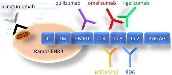 Organization of cell-expressed IgE-Fc and schematic depiction of the location of epitopes of targeting antibodies (CD19 for blinatumomab). IC: intracellular domain, TM: transmembrane domain, EMPD: extracellular membrane–proximal domain, Cε2–4: Fcε domains 2–4, 3× FLAG: 3 repeats of FLAG-tag.