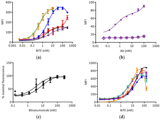 Cell surface staining experiments: (a) Binding of BiTE antibodies to the Ramos-Fcε cell line (black: blinatumomab, red: omalizumab, blue: 8D6, green: ligelizumab, orange: MEDI4212, purple: quilizumab); (b) Binding of quilizumab to Ramos-Fcε cell line (full circles-full line: induced Ramos-Fcε cell line, empty circles-full line: doxycycline-induced Ramos cell line transformed with an empty vector, full circles-dashed line: uninduced Ramos-Fcε cell line, full diamond: cells stained with secondary reagent only, empty diamond: cells only); (c) Binding of blinatumomab to: induced Ramos-Fcε cell line (full circles-full line) and induced Ramos cell line transformed with an empty vector (empty circles-full line). Full diamond: cells stained with secondary reagent only, empty diamond: cells only; (d) Binding of BiTE antibodies to the Jurkat E6-1 cell line (color scheme as in (a)). All measurements were done at least in duplicates. MFI: mean fluorescence units resulting from the signal of bound antibody conjugates (a,c) anti-pentahis-AlexaFluor® 488, (b) anti-human-IgG-phycoerythrin (PE), (d) anti-pentahis-AlexaFluor® 647.